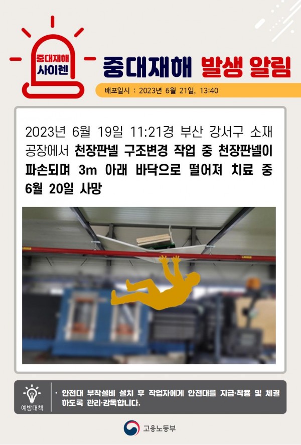 <중대재해>천장판넬 구조변경 작업 중 떨어짐 페이지 정보 작성자 안전경영컨설팅 작성일23-08-31 16:43 조회4,131회 댓글0건 관련링크 이전글 다음글 목록 본문 . 댓글목록 등록된 댓글이 없습니다. 이전글 다음글 목록