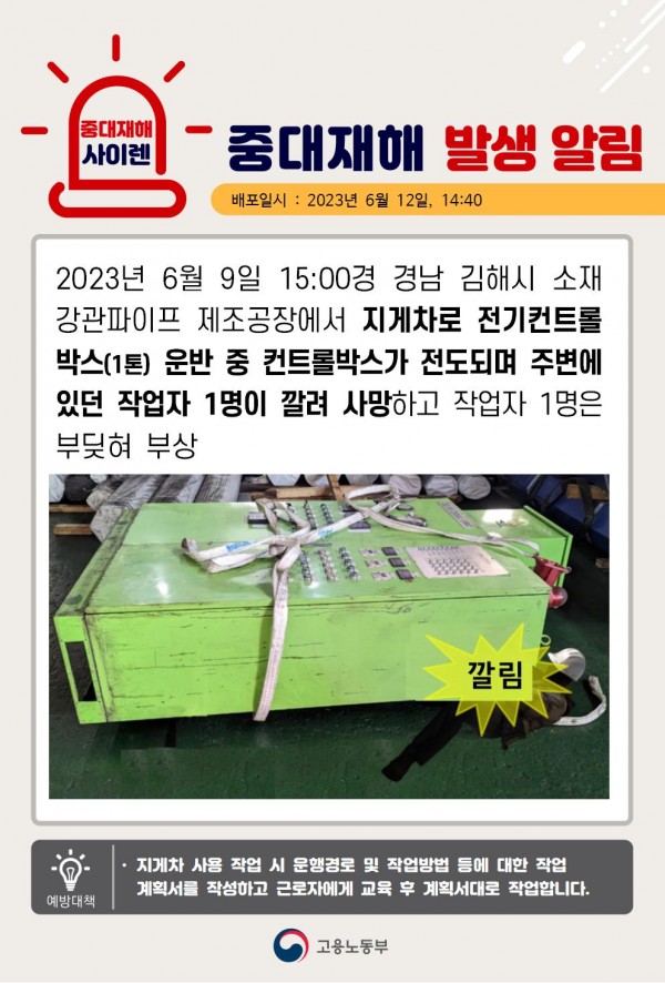 지게차 전기 컨트롤 박스 운반 중 깔림 재해. 페이지 정보 작성자 안전경영컨설팅 작성일23-08-31 16:47 조회4,282회 댓글0건 관련링크 이전글 다음글 목록 본문 . 댓글목록 등록된 댓글이 없습니다. 이전글 다음글 목록