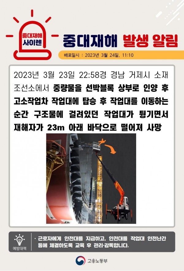 <중대재해> 조선소 고소작업차 작업 중 근로자 추락 페이지 정보 작성자 안전경영컨설팅 작성일23-03-28 09:04 조회4,497회 댓글0건 관련링크 이전글 다음글 목록 본문 . 댓글목록 등록된 댓글이 없습니다. 이전글 다음글 목록