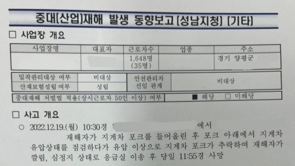 <중대재해> 지게차 점검 중 포크에 깔림 페이지 정보 작성자 안전경영컨설팅 작성일23-03-28 09:04 조회4,768회 댓글0건 관련링크 이전글 다음글 목록 본문 . 댓글목록 등록된 댓글이 없습니다. 이전글 다음글 목록