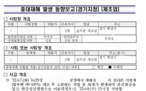 <중대재해>실리콘 지연제 소분 작업중 화재 페이지 정보 작성자 안전경영컨설팅 작성일22-07-14 09:11 조회5,115회 댓글0건 관련링크 이전글 다음글 목록 본문 . 댓글목록 등록된 댓글이 없습니다. 이전글 다음글 목록