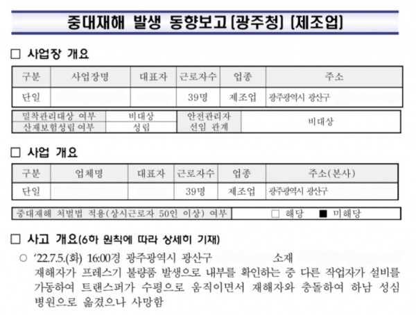 <중대재해> 프레스 점검 작업 중 타 근로자 작동으로 인한 끼임 페이지 정보 작성자 안전경영컨설팅 작성일22-07-14 09:14 조회5,503회 댓글0건 관련링크 이전글 다음글 목록 본문 . 댓글목록 등록된 댓글이 없습니다. 이전글 다음글 목록