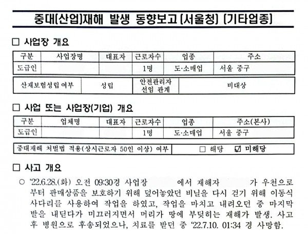 <중대재해> 사다리 이용 중 떨어짐에 의한 머리 부딪힘 페이지 정보 작성자 안전경영컨설팅 작성일22-08-18 08:54 조회5,509회 댓글0건 관련링크 이전글 다음글 목록 본문 . 댓글목록 등록된 댓글이 없습니다. 이전글 다음글 목록