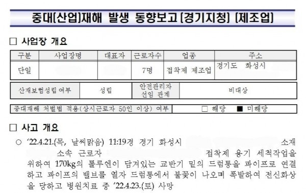 <중대재해> 접착제 제조업 폭발로 인한 화상 페이지 정보 작성자 안전경영컨설팅 작성일22-06-07 10:24 조회5,219회 댓글0건 관련링크 이전글 다음글 목록 본문 . 댓글목록 등록된 댓글이 없습니다. 이전글 다음글 목록