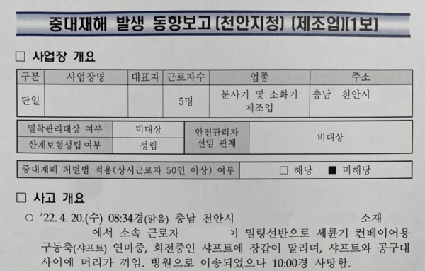 <중대재해> 밀링선반 작업 중 샤프트에 장갑 말려 끼임 페이지 정보 작성자 안전경영컨설팅 작성일22-06-07 10:24 조회5,800회 댓글0건 관련링크 이전글 다음글 목록 본문 . 댓글목록 등록된 댓글이 없습니다. 이전글 다음글 목록