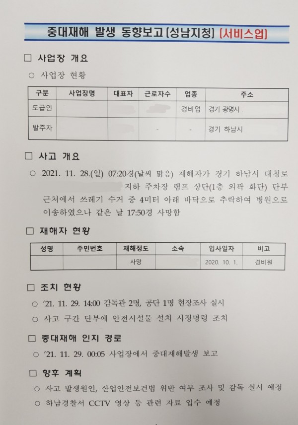 <중대재해> 경비인 쓰레기 수거 작업 중 떨어짐(추락)
