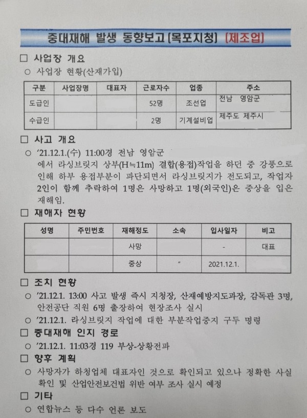 <중대재해> 조선업 용접 작업 중 근로자 떨어짐(추락)