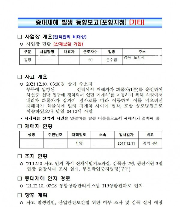 <중대재해> 화물차, 지게차 사이 협착 사고