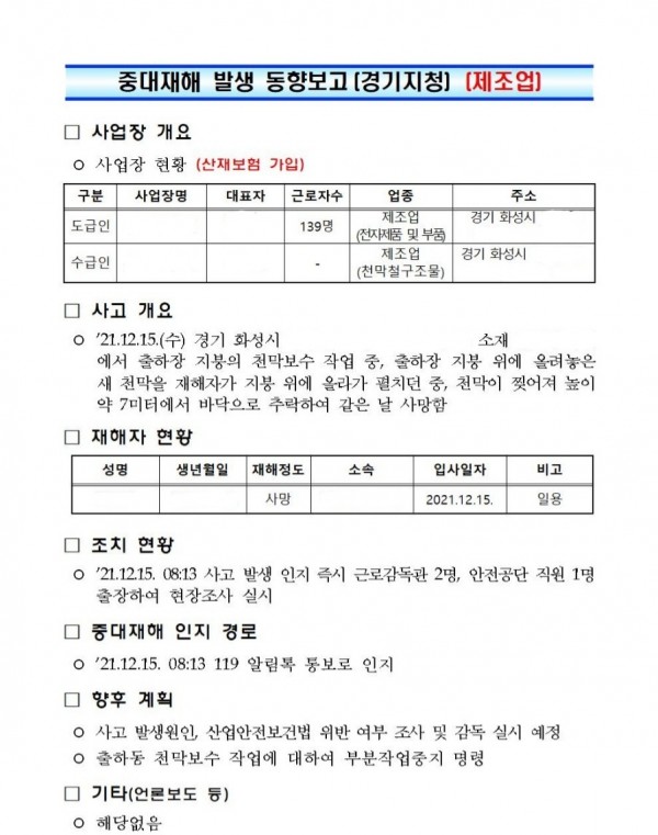 <중대재해> 지분 천막보수 작업 중 추락