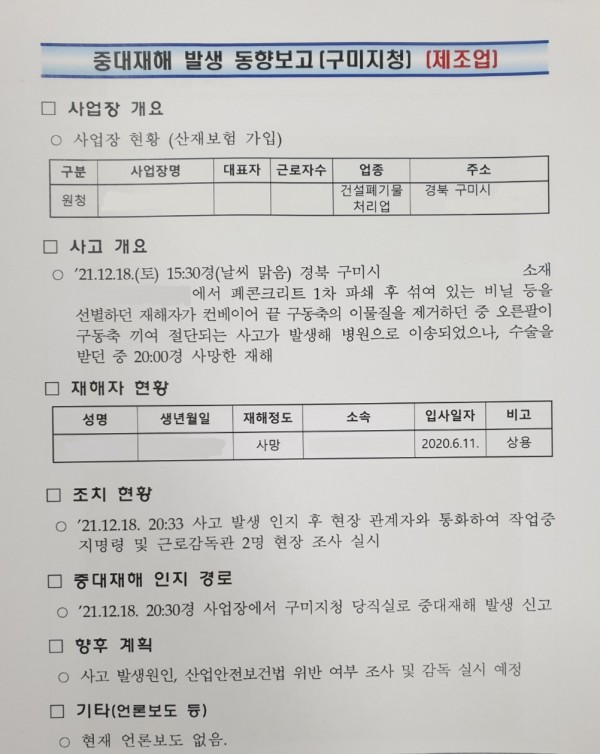 <중대재해> 폐콘크리트 작업장 컨베이어 이물질 제거 중 끼임 재해