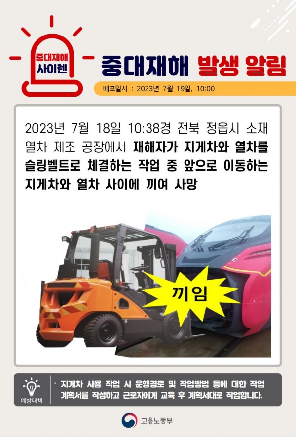 <중대재해>지게차와 열차 슬링벨트 체결 중 끼임사망 페이지 정보 작성자 안전경영컨설팅 작성일23-08-31 16:39 조회5,207회 댓글0건 관련링크 이전글 다음글 목록 본문 . 댓글목록 등록된 댓글이 없습니다. 이전글 다음글 목록